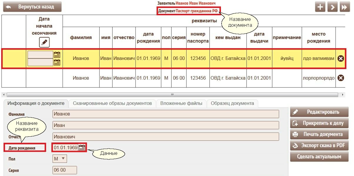Для набора меток %%%ДокумДело. существует возможность печати значения реквизита ("Данные") документа из его описания. Например, если в описании документа «Паспорт гражданина РФ» существует реквизит «номер_паспорта», то вы можете использовать метку %%%ДокумДело.РеквизитД.номер_паспорта%%%, что позволит напечатать значение номера паспорта из документа, привязанного к делу, т.е. метка состоит из %%%ДокумДело.РеквизитД.«название реквизита из описания документа» %%%.