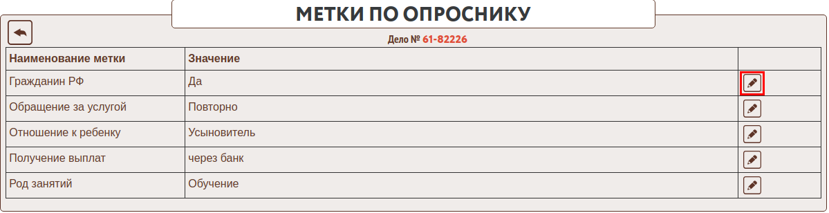 - после опроса заявителя у операциониста при формировании списка документов одновременно формируется список имя метки - значение метки.