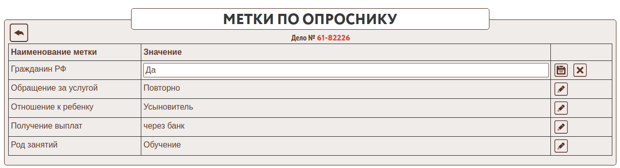 При опросе заявителя на каждый ответ может быть сопоставлена метка и ее значение. После опроса заявителя у операциониста при формировании списка документов одновременно формируется список имя метки - значение метки. Данные метки далее могут быть отредактированы специалистом МФЦ и применены в любом шаблоне.