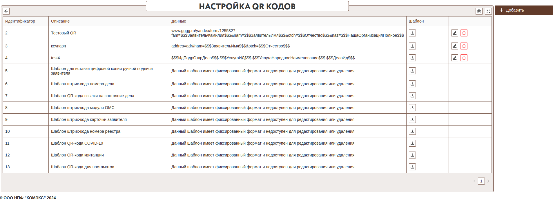 Если для МФЦ необходимо создать новый QR код, то можно это сделать перейдя в пункт меню Настройки->Управление бланками печати документов->Настройка QR кодов. В появившейся таблице будут указаны фиксированные шаблоны изображений, а так же пользовательские QR коды. Для создания собственного QR кода необходимо указать его описание (для чего используется) и данные, которые будут кодировать в код. В поле данных можно использовать метки формата $$$Метка$$$ для автоматического заполнения данными из дела. После добавления соответствующей информации, в таблице появится кнопка, позволяющая сгенерировать картинку, которую необходимо вставить в документ для замены. Эту картинку можно скачать в любое время и он уже будет неизменным.