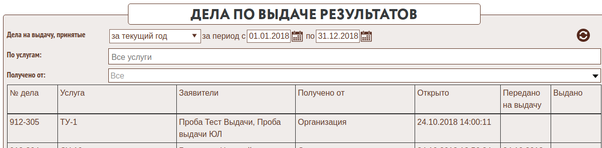 Для контроля дел, созданных через сервис, служит форма «Дела по выдаче результатов»