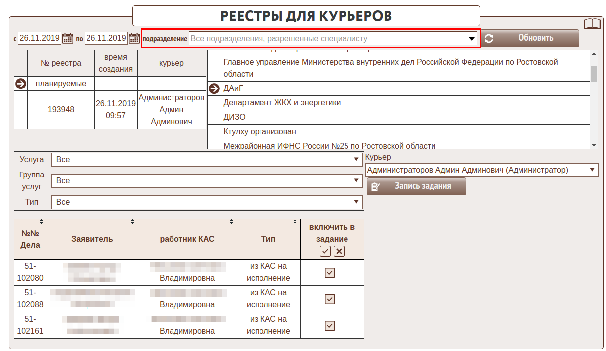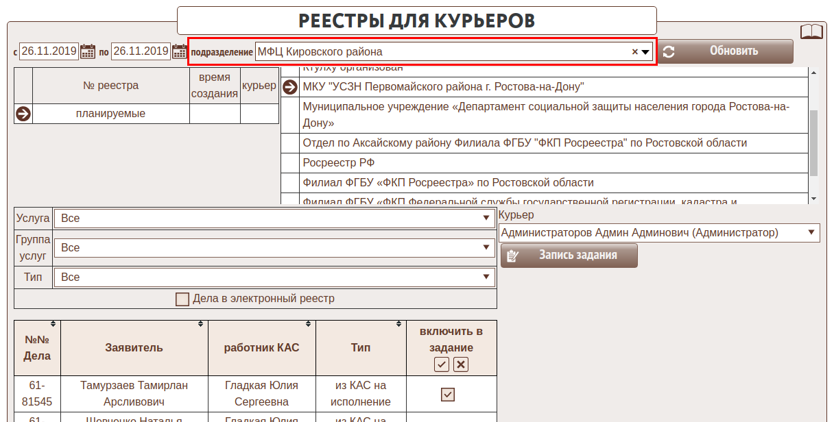 Ранее списки для курьеров формировались исключительно для того подразделения КАС, с которым работал в данный момент специалист МФЦ. В ИИС внесено изменение, позволяющее выбрать любое подразделение КАС, разрешенное специалисту МФЦ, либо все подразделения вместе. Фильтр действует на список реестров, список подразделений и список дел (планируемые) для формирования реестра. Для сформированного реестра список дел отображается независимо от включенного фильтра.