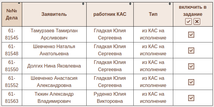 Список дел может быть отсортирован по любой колонке щелчком по заголовку, например, по номеру дела и заявителю