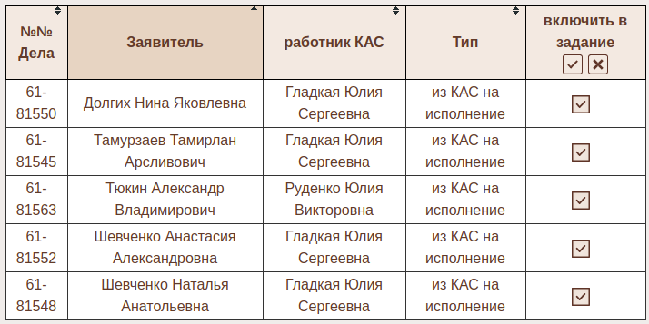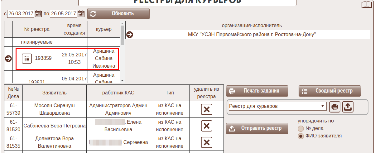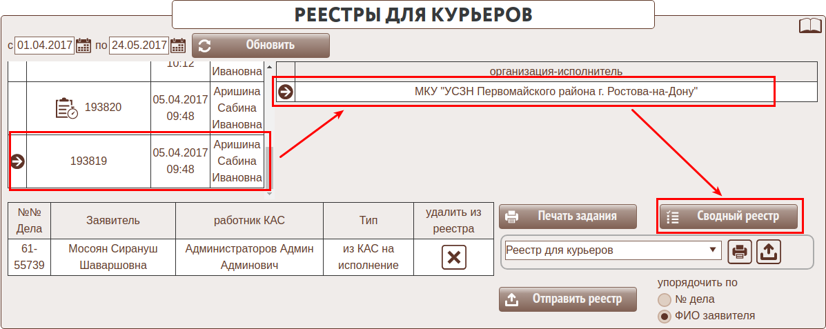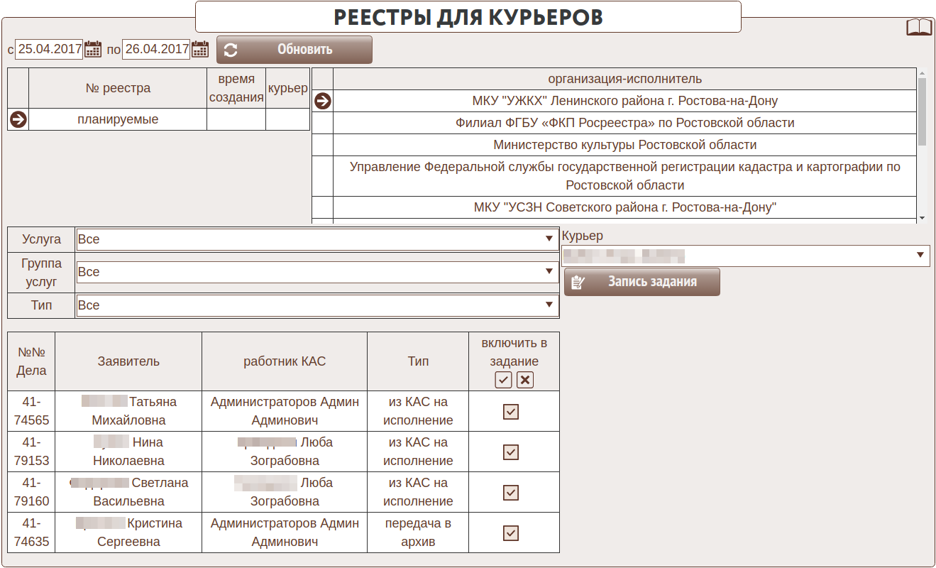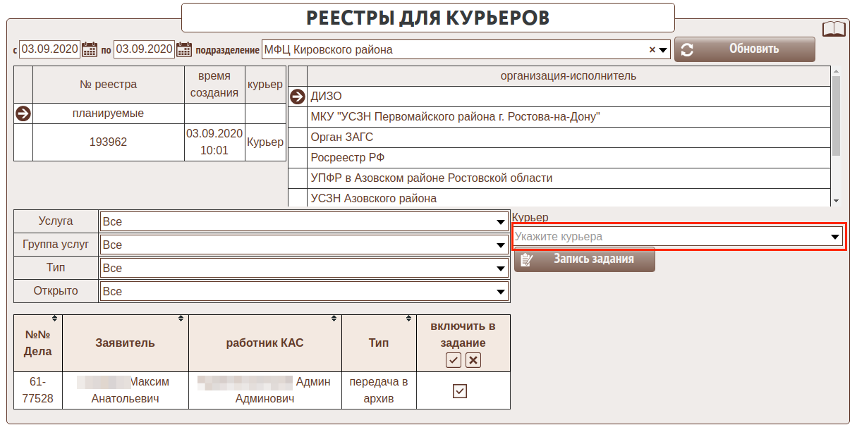 Менеджер отмечает дела для передачи курьеру и определяет, какому курьеру выдать задание (из списка существующих в МФЦ курьеров) для каждой организации из правой таблицы.