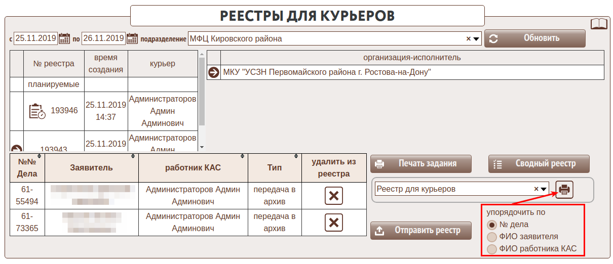 После записи задания у менеджера появляется возможность напечатать реестр дел по организации. ( с возможностью указания сортировки: по № дела, либо по ФИО)