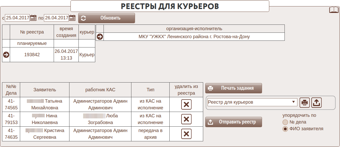 В верхней таблице показаны за заданный период существующие реестры для курьеров, а в строке планируемые, собраны дела, переданные в курьерскую службу из КАС, но не выданные курьерам на исполнение.