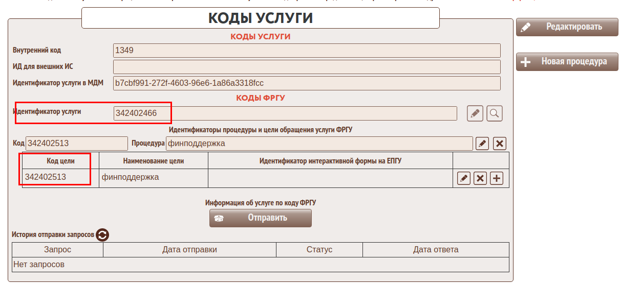 Для каждой услуги указать коды услуги и коды цели