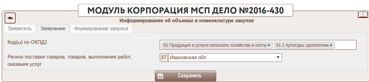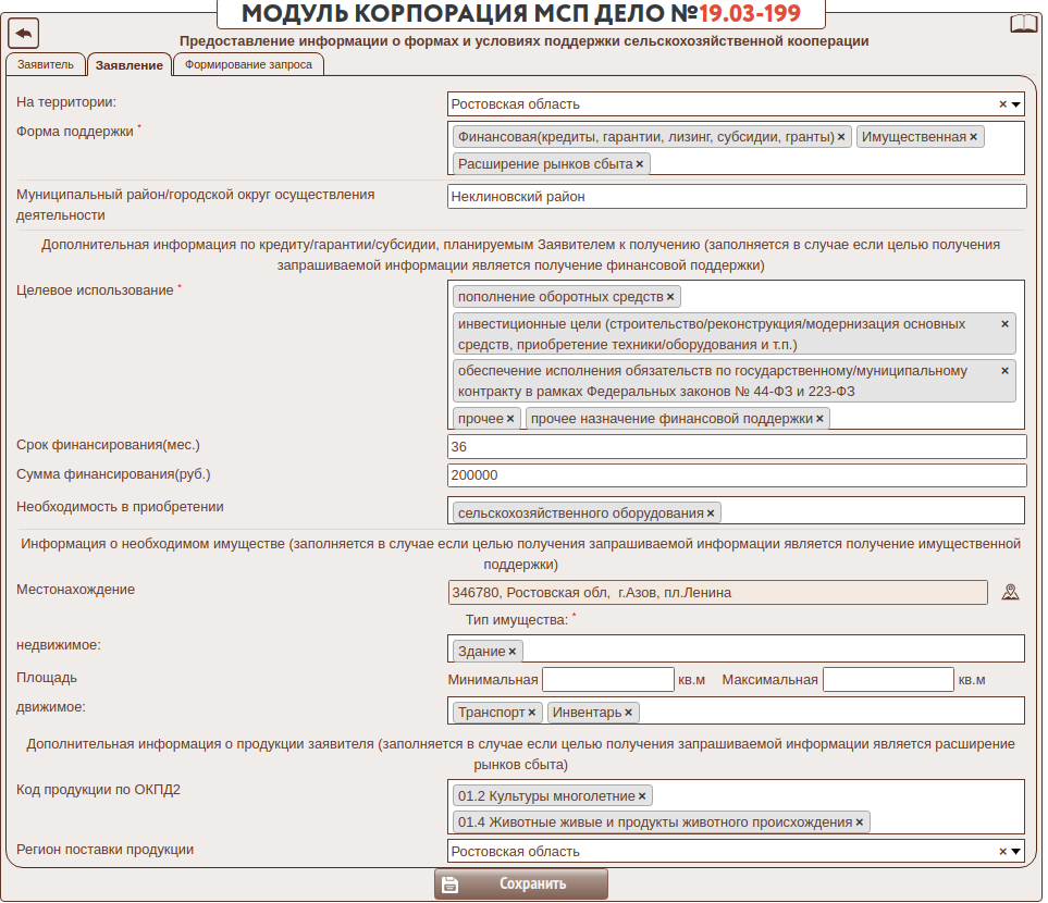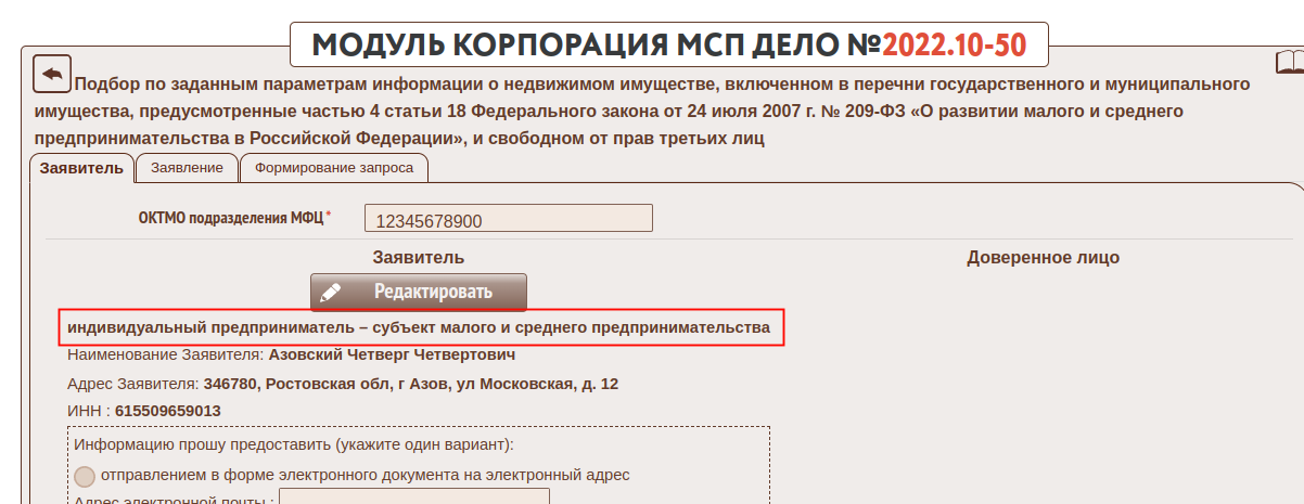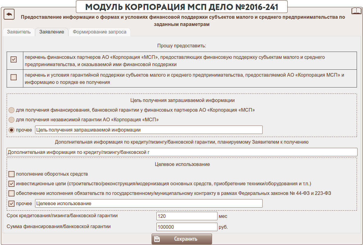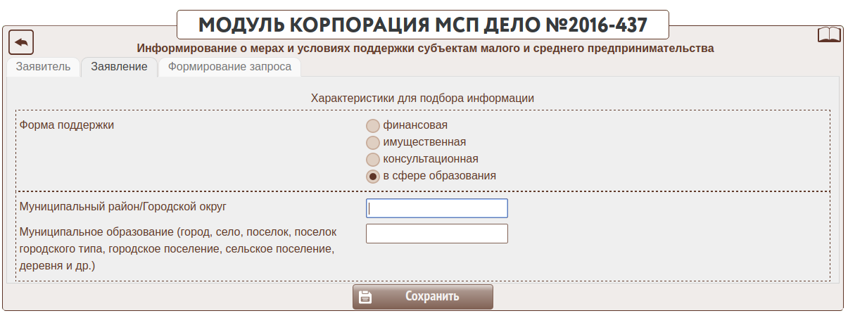 При открытии дела по услуге Корпорации МСП операционист получает доступ к специализированной форме