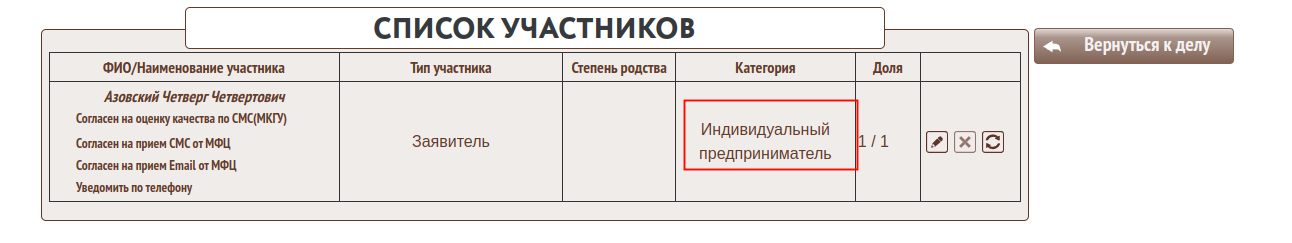 Категория заявителя (Физическое лицо, ИП, Самозанятый) устанавливается по категории в списке участников услуги: