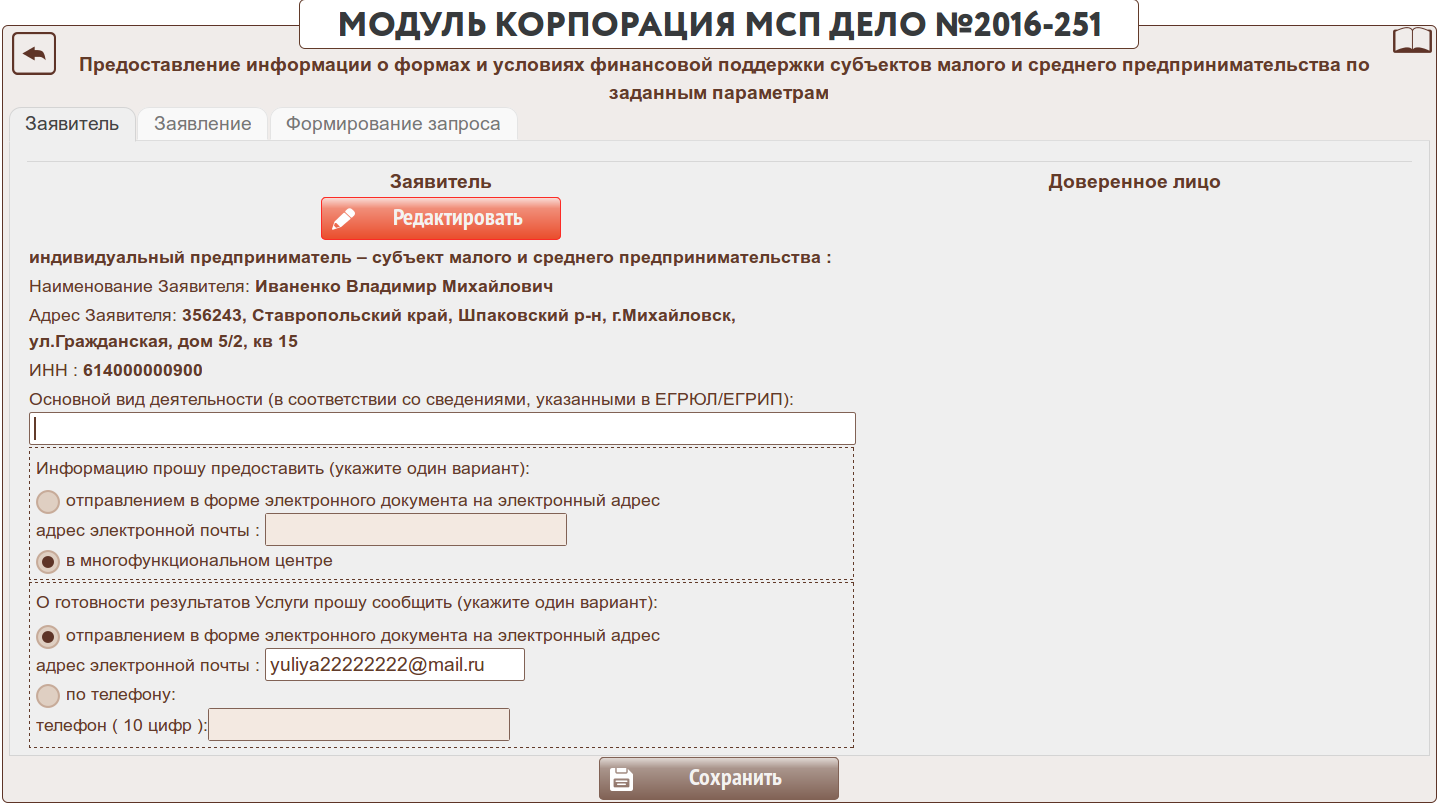 для услуги *Информирование о мерах и условиях поддержки субъектам малого и среднего предпринимательства *