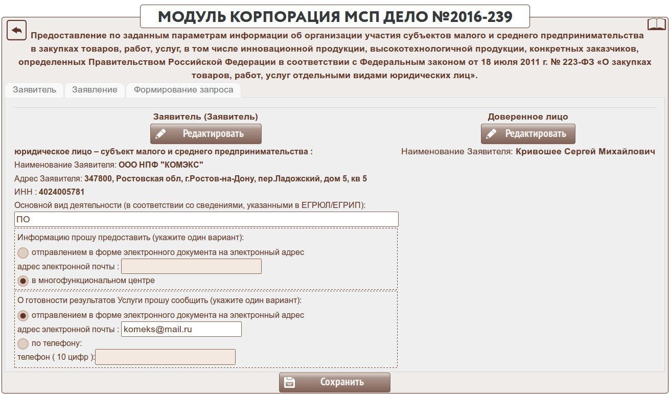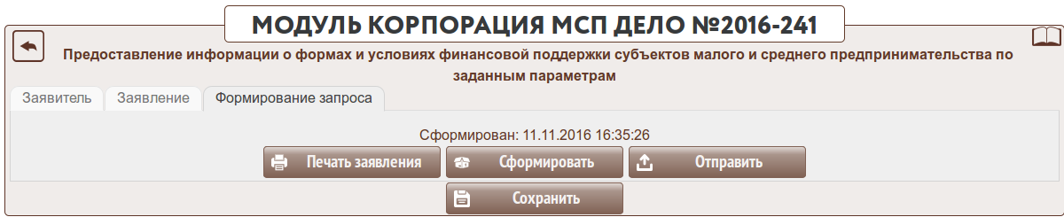 - Формирование запроса - формирование файла запроса для передачи сервису Корпорации МСП, проверка правильности его заполнения и передача транспорту СМЭВ 3.
