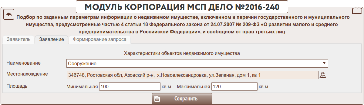 для услуги Подбор по заданным параметрам информации о недвижимом имуществе, включенном в перечни государственного и муниципального имущества, предусмотренные частью 4 статьи 18 Федерального закона от 24.07.2007 № 209-ФЗ «О развитии малого и среднего предпринимательства в Российской Федерации», и свободном от прав третьих лиц