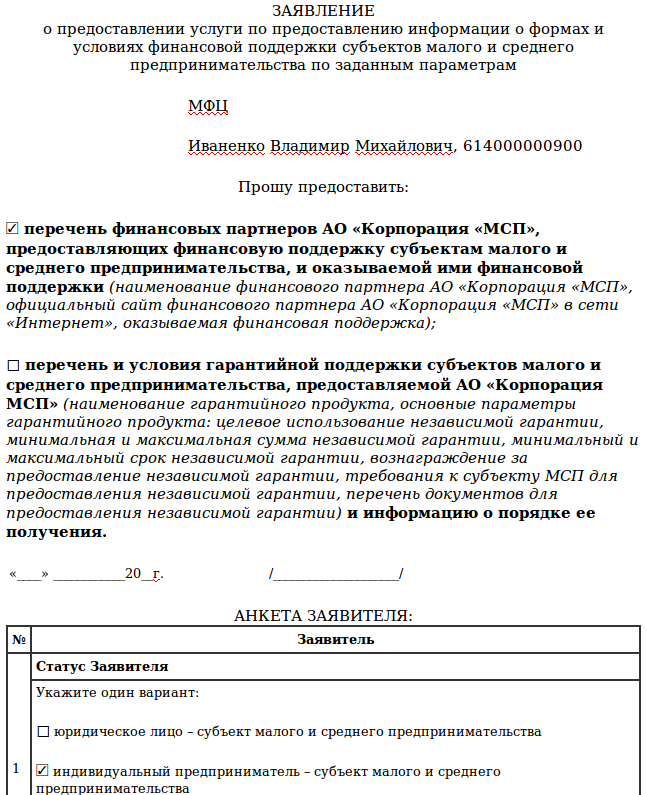 для услуги Предоставление информации о формах и условиях финансовой поддержки субъектов малого и среднего предпринимательства по заданным параметрам