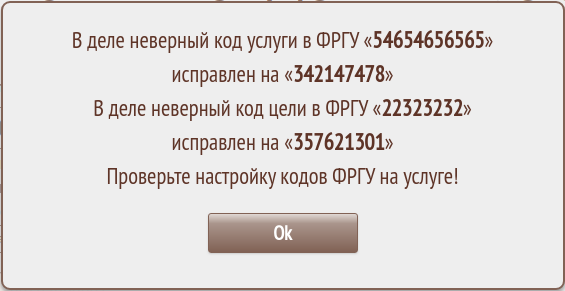 При сохранении заявления происходит проверка Кода услуги и Кода цели по ФРГУ.