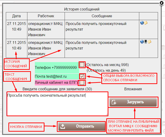 Данная форма предназначена для отправки сообщений заявителю с помощью СМС, электронной почты и через личный кабинет на портале МФЦ. Перед использованием система отправки сообщений должна быть настроена .