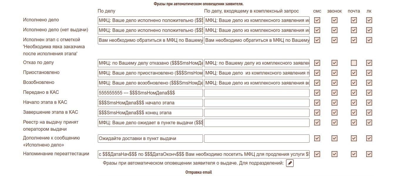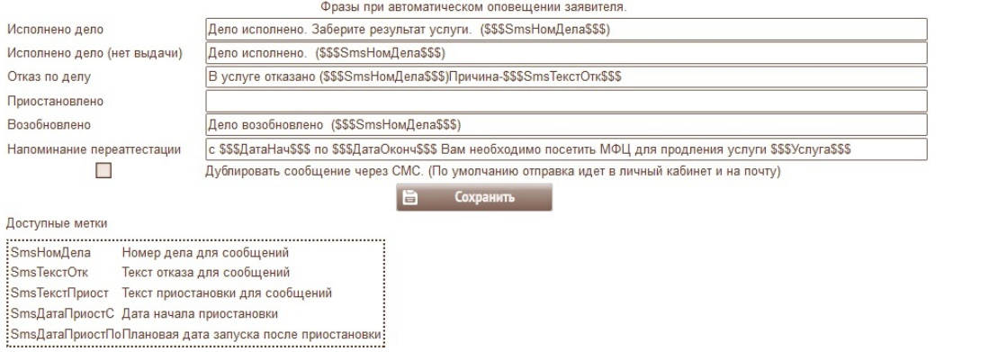 Для информирования заявителей по делам, входящим в комплексный запрос, раздел "Фразы при автоматическом оповещении заявителя" расширен: