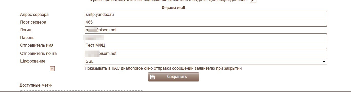В этой части формы настройки оповещений заявителя можно настроить параметры для рассылки сообщений с помощью электронной почты