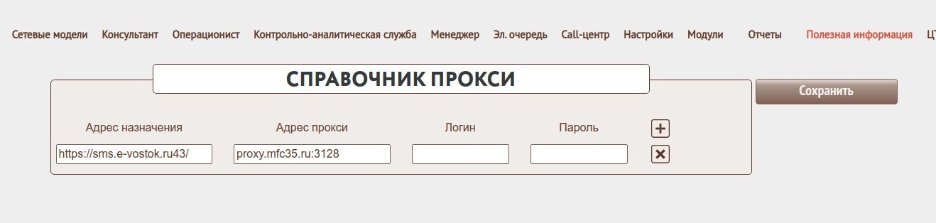 При необходимости можно указать настройки прокси для отправки СМС. Это можно сделать с помощью формы "Справочник прокси", доступной через меню "Настройки-> Настройки -> Справочник прокси" пример настройки :