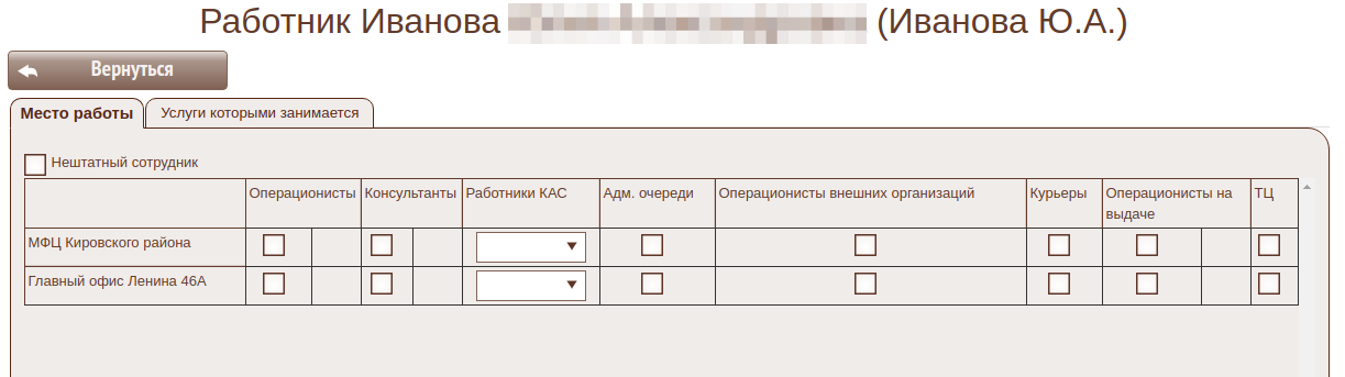 Форма настроек пользователя у Менеджера имеет ограничения: - «Менеджер» имеет возможность редактировать настройки пользователя «Место работы» и «Услуги, которыми занимается». - «Менеджер» может редактировать только тех Пользователей, с которыми у него совпадает «Место работы» (структурные подразделения). - Административные роли недоступны.