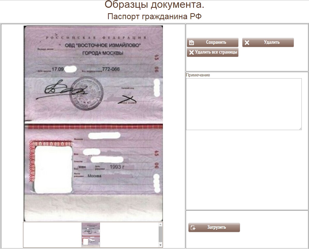 На форме редактирования можно увидеть все загруженные страницы документа и изображение выбранной страницы. Для переключения активной страницы выберете нужную Вам страницу снизу в списке страниц. К страницам можно заполнить поле "Примечание", которое будет доступно для всех специалистов. После изменения примечания нужно нажать кнопку "Сохранить" в верхней части формы. Можно удалить одну (текущую) страницу или все страницы документа. Можно заменить текущий образец или добавить новые изображения в конец.
