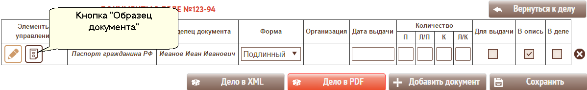 Образцы документов доступны операционистам в списке документов при работе с делом. Для просмотра нужно нажать иконку "Образец документа"