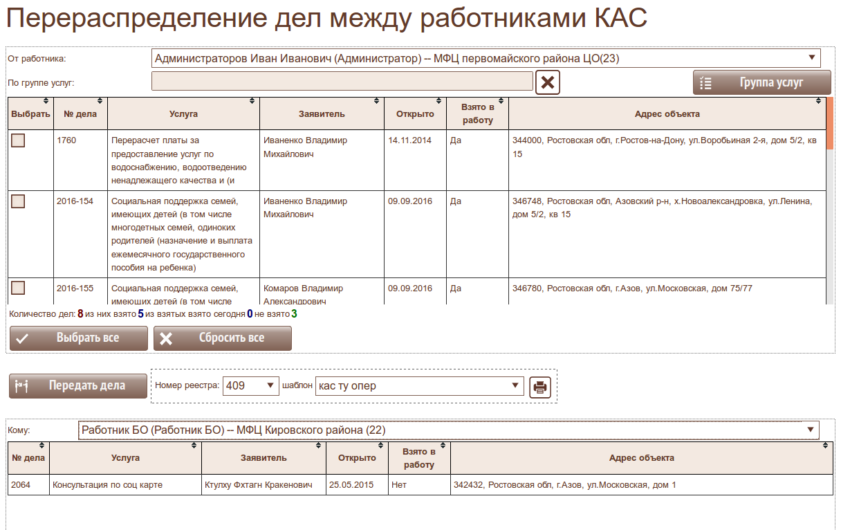 Менеджер выбирает специалиста КАС, у которого нужно забрать дела. В верхней таблице отображается список дел в работе у этого специалиста. Менеджер отмечает те из них, которые нужно передать. Для удобства существует возможность