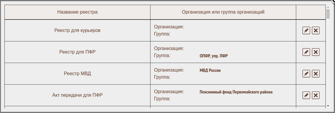 существует возможность указать организацию-исполнитель или группу организаций для каждого реестра