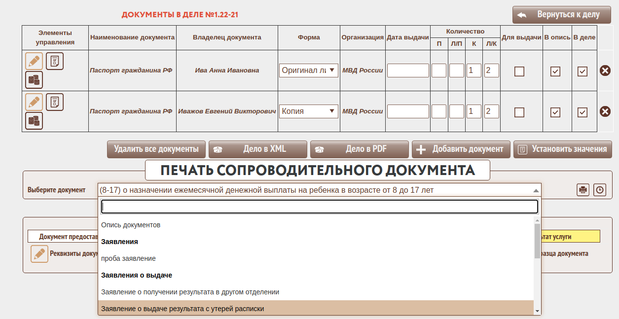 "ПЕЧАТЬ СОПРОВОДИТЕЛЬНОГО ДОКУМЕНТА", в "ДОКУМЕНТЫ В ДЕЛЕ"