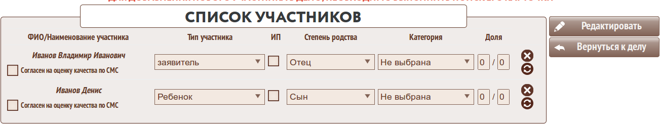 Обращаем внимание, что в списке участников услуги обязателно указание степени родства