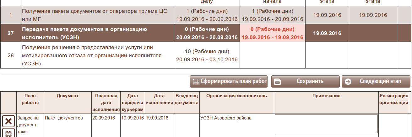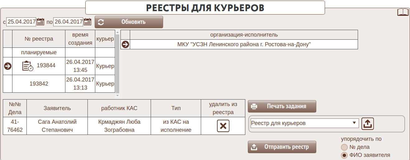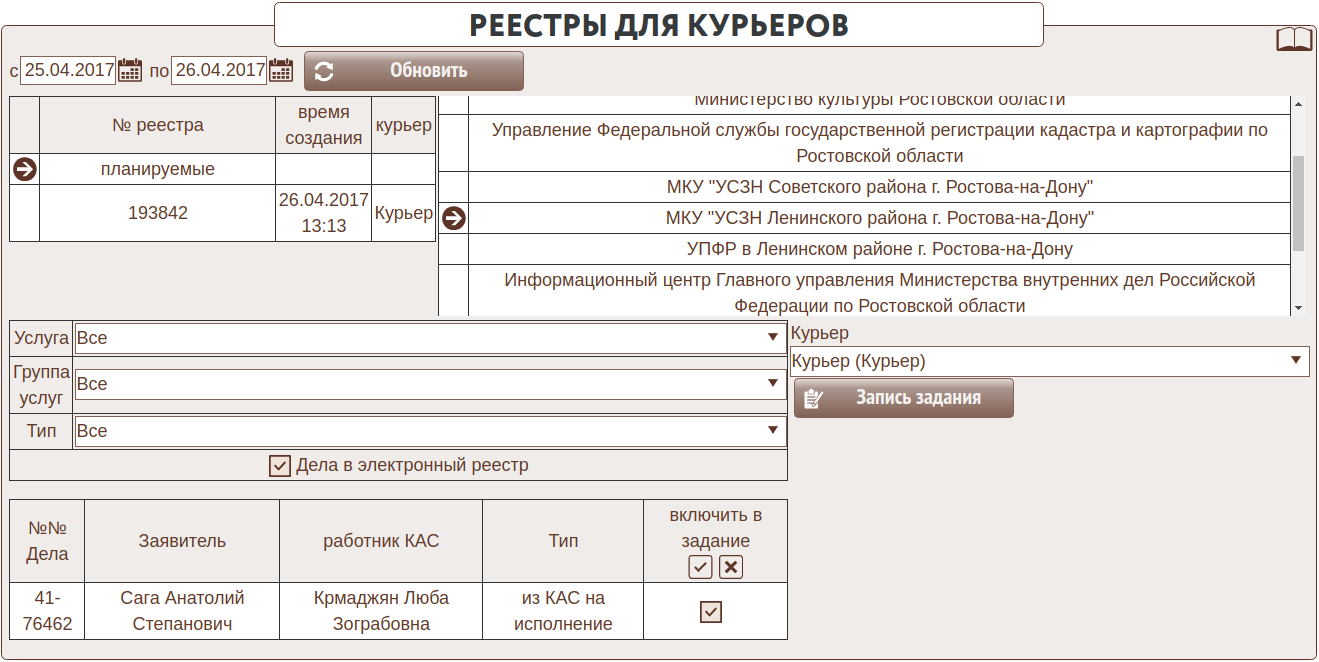 в Заданиях курьерам формируется реестр для УСЗН: