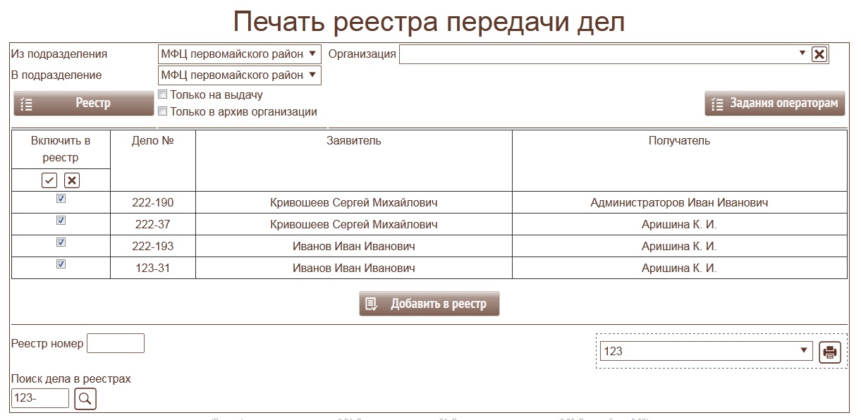 Формировать реестр можно в любой момент. В реестр попадут все дела, переданные за период от момента формирования предыдущего реестра до текущего времени с учетом подразделений МФЦ. Номер реестра автоматически наращивается на единицу.