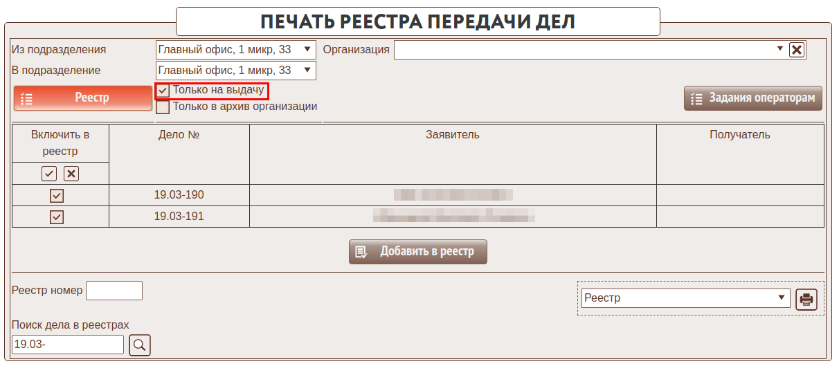 После закрытия дел обязательно формируется реестр дел на выдачу.