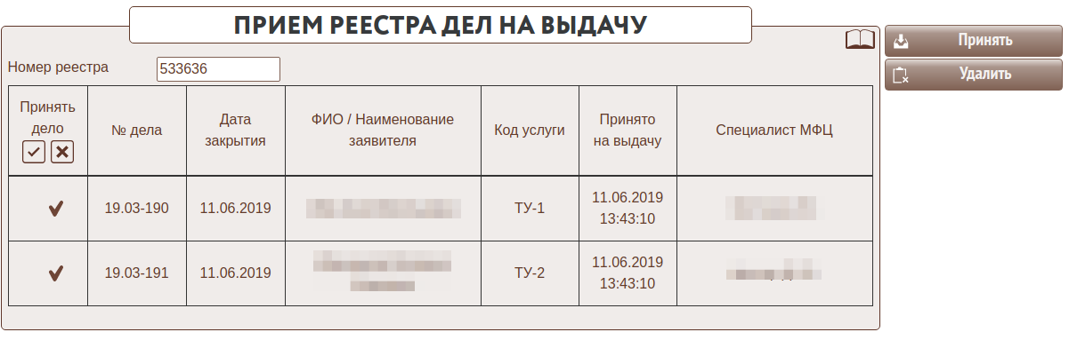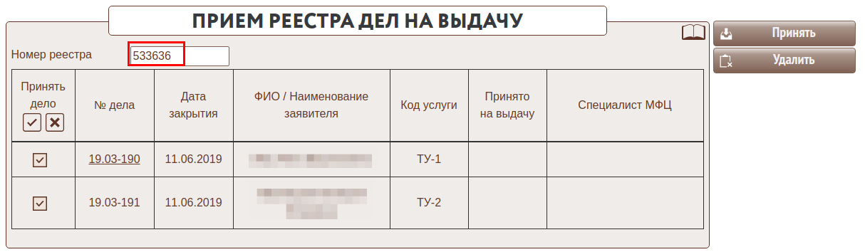 Данная технология требует обязательного формирования реестра и отметок о его приеме, что усложняет работу, поэтому если в подразделении нет нужды в разделении СМС на закрытие и готовности дела к выдаче, то можно не устанавливать настройку и работать по старой технологии.
