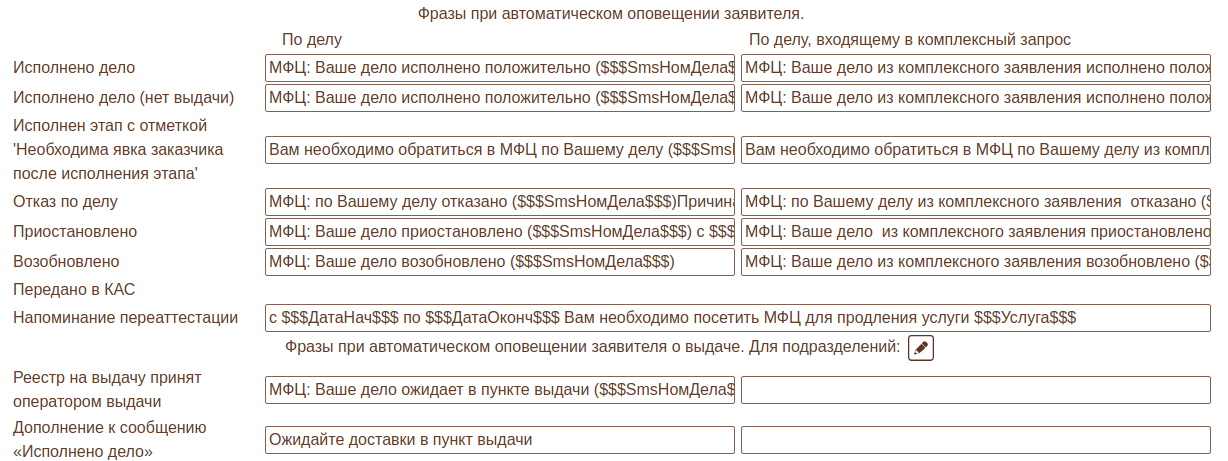 В случае, если ВСЕ подразделения МФЦ должны работать по новой технологии, то можно отказаться от отправки СМС по закрытию дела - оставив пустыми поля "Исполнено дело" и "Дополнение к сообщению «Исполнено дело»". Тогда СМС будет формироваться только по событию приема дела из реестра в данной форме.