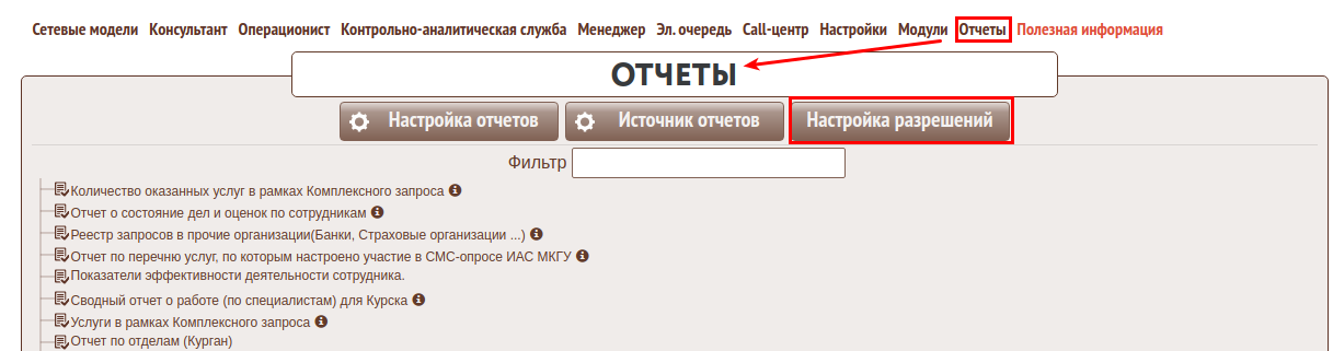 Для модераторов схем услуг в форме "Отчеты" (Меню: Отчеты) доступна кнопка "Настройка разрешений"