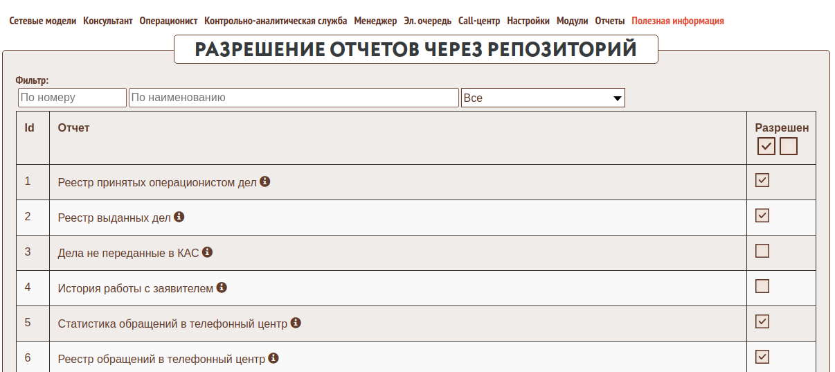 Существует возможность (включается как отдельный модуль) централизованной настройки списка доступных для МФЦ отчетов.