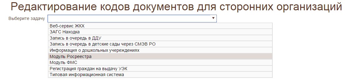 Выбираем организацию исполнителя услуги. В данном случае Росреестр. Открывается список документов и связанных с ними кодов. Коды документов необходимо брать из справочника документов Росреестра.