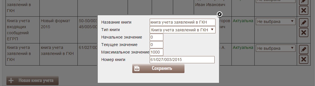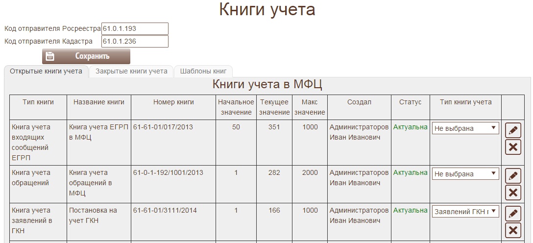 Книги учета обращений ведутся в Росреестре. Для работы модуля необходимо создать книги учета в ИИС МФЦ. Номера книг можно получить в региональном отделении Росреестра.