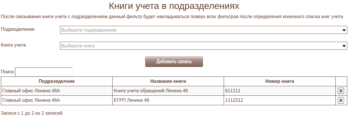 Можно указать связь книг учета и подразделения МФЦ. После связи книг учета и подразделения данный фильтр будет накладываться поверх всех остальных фильтров. Если в подразделении будут книги учета (то будут оставлены только они). Если в подразделении не будет книг учета, то данный фильтр будет проигнорирован.