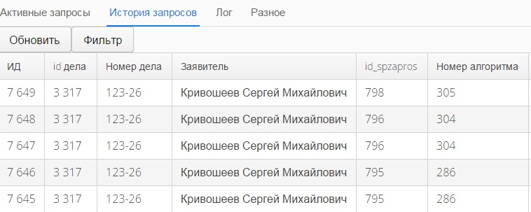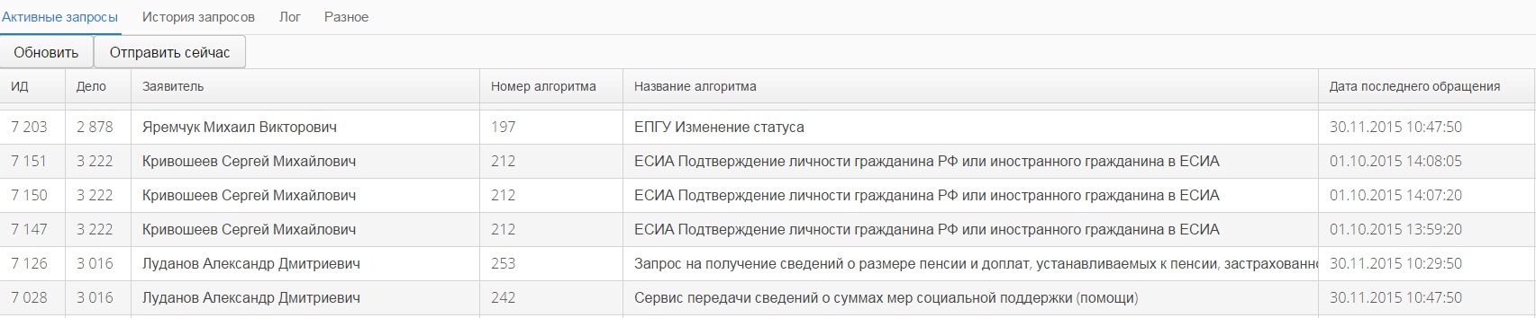 "Активные запросы" - таблица в которой представлена информация о поступивших от операционистов запросов и еще не отправленных в СМЭВ.