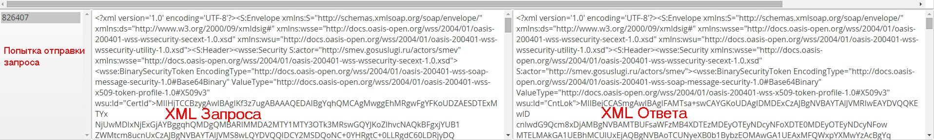 Внизу формы "История запросов" присутствует таблица из трёх колонок, в которой отображены попытки запросов, а так же xml запроса и ответа по выбранному ранее документу.