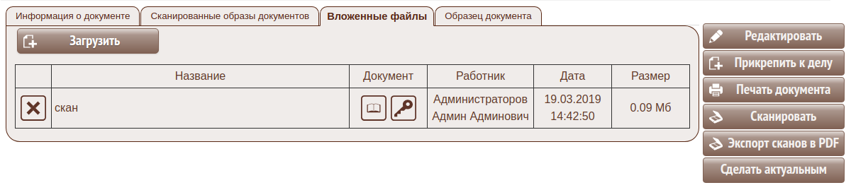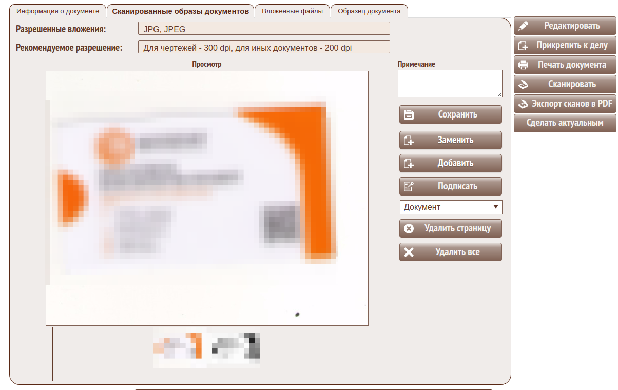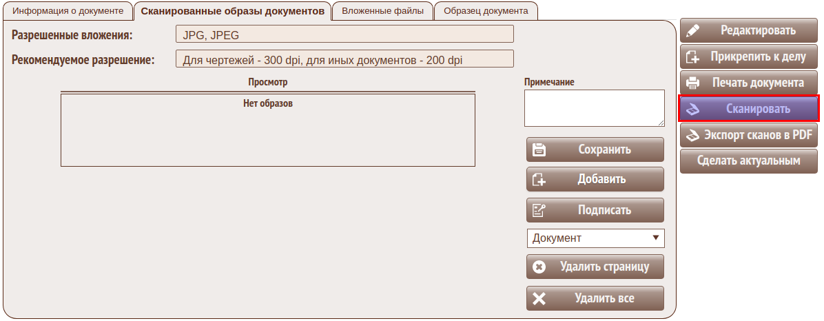 Поддерживается 2 варианта сохранения: Сохранить на вкладку "Сканированные образы документов" и сохранить в формате PDF на влкадку "Вложенные файлы".