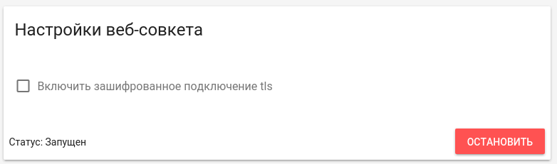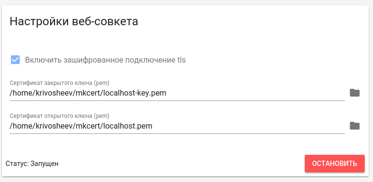 После включения этой настройки необходимо указать сертификаты закрытого и открытого ключа, которые имеют подпись довереннего центра сертификации и настроены для работы с хостом localhost. После указания сертификатов необходимо перезапустить вебсокет. Вебсокет будет поддерживать одновременно обычное подключение и защищенное. Порты для обнычного подключения 8181 и защищенное 8182.