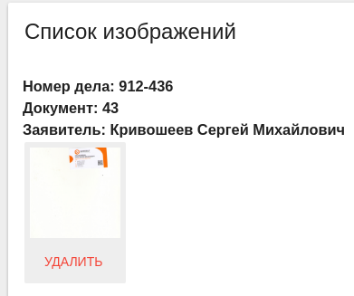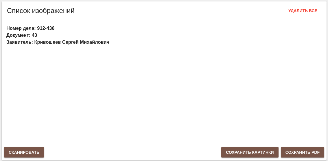В момент открытия диалогового окна для сканирования будут переданы данные о номере дела, документе и заявителе. Интерфейс сканирования станет активным.