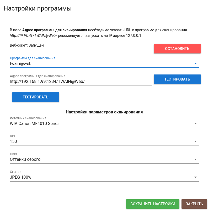 При сканировании через локальную программу будет вызываться всплывающее окно для выбора параметров сканирования. После закрытия окна будет производиться обработка отсканированных файлов и добавляться в программу.