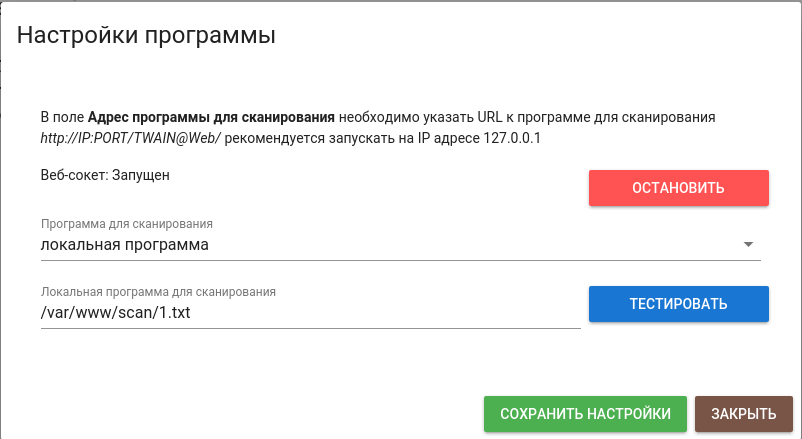 Для настройки сканирования через локальную утилиту необходимо указать путь до исполняемого файла и протестировать корректность работы. При выборе сканирования через локальную программу в верхней части экрана пропадет значек статуса соединения с программой twain@web.
