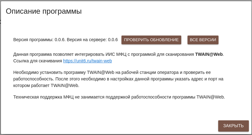 Данная программа позволяет интегрировать ИИС МФЦ с программой для сканирования TWAIN@Web или локальной утилитой для сканирования. Ссылка для скачивания https://unit6.ru/twain-web. Скачать утилиту для сканирования можно на страницы со скачиванием Electron.