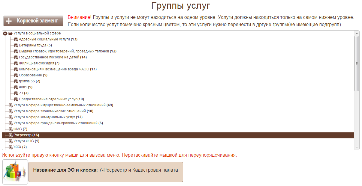 ВНИМАНИЕ! Группа услуг НЕ должна одновременно содержать услуги и подгруппы! При этом количество услуг на этой группе отображается красным цветом.