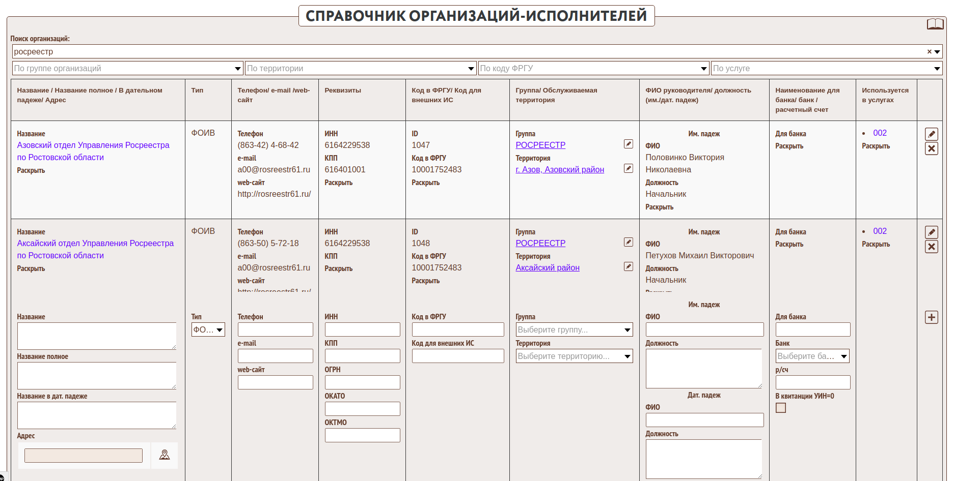Справочник предназначен для ввода / редактирования организаций, участвующих в оказании услуг.