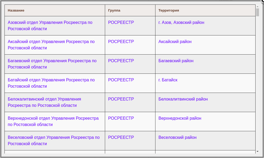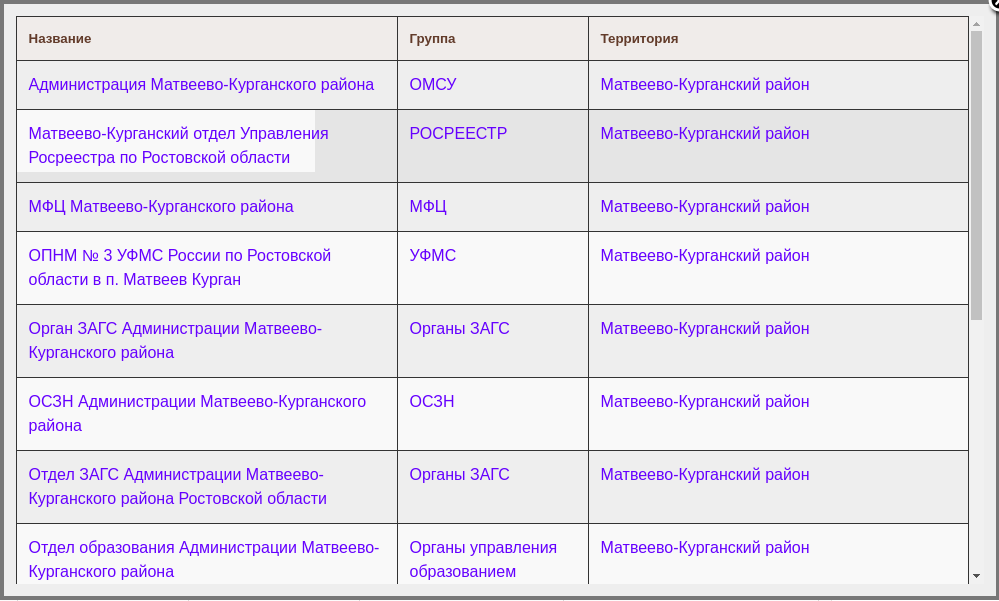 С наименования территории возможен переход на список организаций, обслуживающих эту территорию
